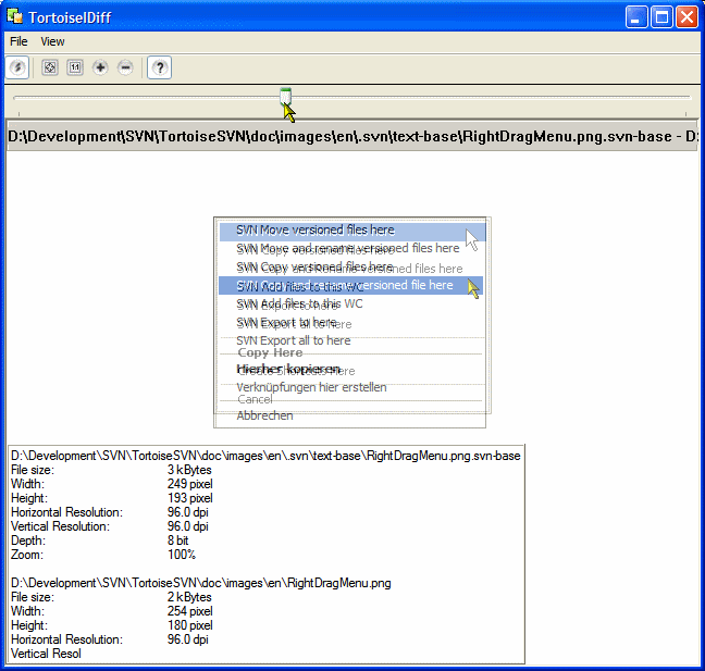 對於這些檔案,無法使用常見的檔案差異比較工具,因為它們僅適用於文字檔並逐行比較差異。這就是 Tortoise Image Diff 工具 (TortoiseIDiff) 派上用場的地方。它可以並排顯示兩張圖片,甚至可以將圖片以 Alpha 混合的方式重疊顯示。