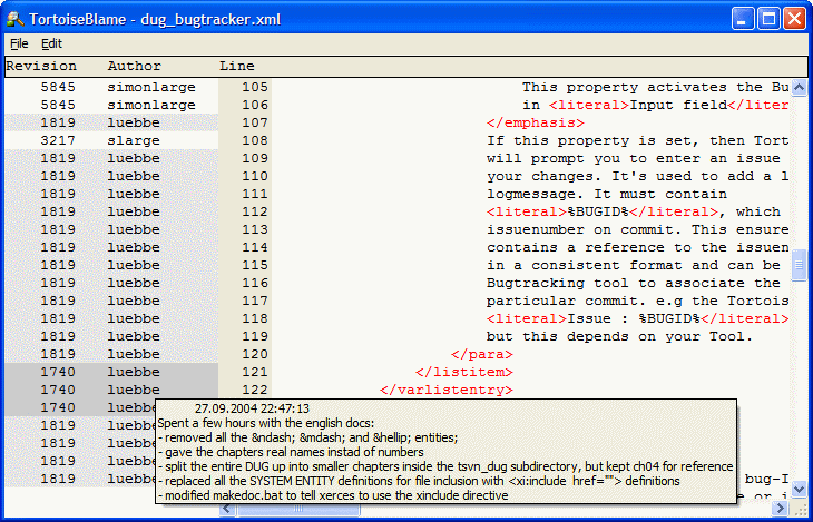 TortoiseSVN 有自己的工具來向您顯示這些 blame。除了其他 Subversion 用戶端顯示的資訊外,當您將滑鼠指標懸停在行上時,它還會在一個小工具提示視窗中顯示每行提交的日誌訊息。