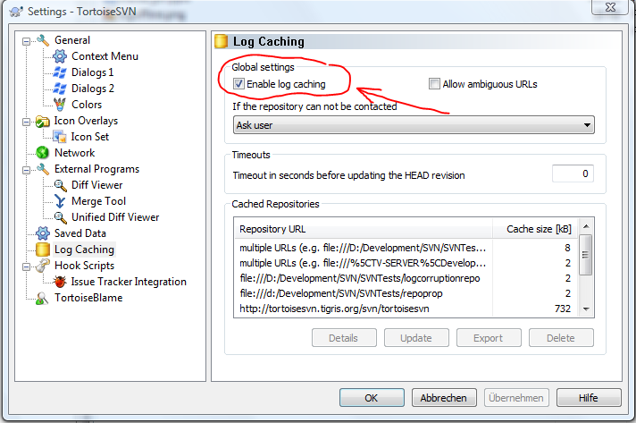 如果您無法直接存取儲存庫,或者由於某些其他原因而無法變更 UUID,您可以在 TortoiseSVN 設定對話方塊中停用記錄快取: