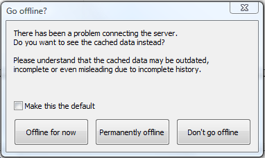如果您無法連線到儲存庫,記錄對話方塊將會顯示一個對話方塊,您可以在其中選擇「離線工作」,也就是說,它將不再嘗試連線到儲存庫,而僅使用快取
