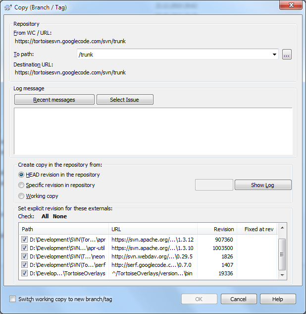 如果外部資源在建立分支或標籤時設定為明確的修訂版本,TortoiseSVN 會自動變更 svn:externals 屬性。當從 HEAD 或儲存庫中的特定修訂版本建立分支/標籤時,TortoiseSVN 會先建立分支/標籤,然後調整屬性。這將為每個屬性建立額外提交。當從工作副本建立分支/標籤時,會先修改屬性,然後建立分支/標籤,然後將屬性變更回其原始值。