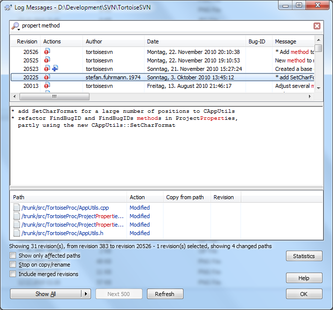 如果在記錄訊息中提及修訂版本,則記錄對話方塊會將這些修訂版本轉換為連結。按一下這些連結將自動選取記錄對話方塊中提及的修訂版本。
