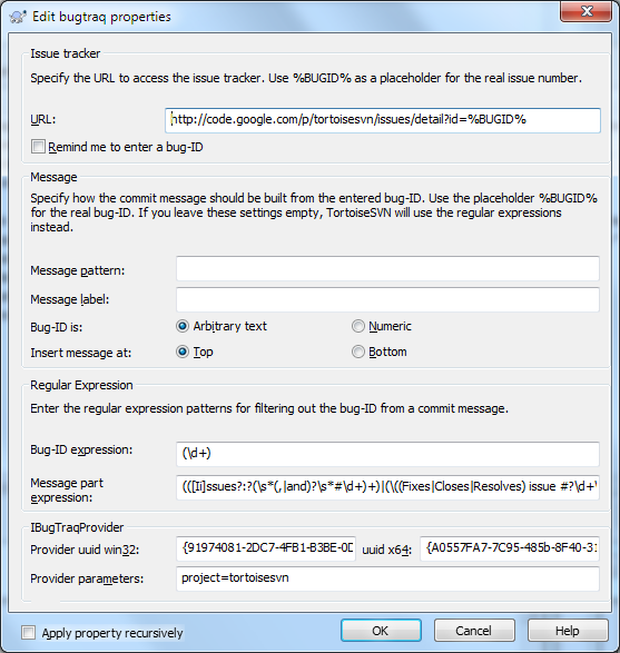 上述螢幕截圖顯示了 svn:externals 和所有 bugtraq: 屬性的新屬性對話方塊。TortoiseSVN 1.7 中提供了更多自訂屬性對話方塊。請參閱文件 以了解所有這些對話方塊。