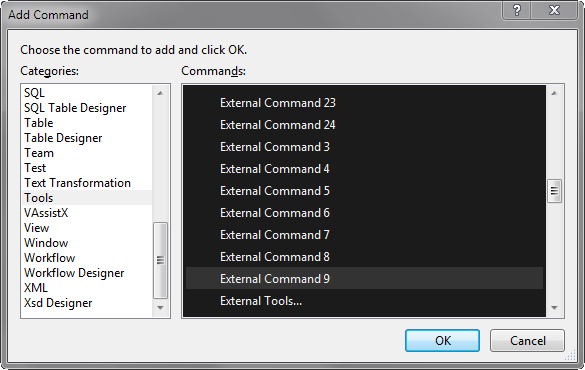 現在您必須選取命令。 問題是自訂命令不會顯示其標題,而只會顯示為外部命令 X,其中 X 是外部命令的編號。