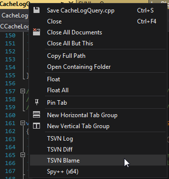 /command:blame /path:"$(ItemPath)" /line:$(CurLine) /startrev:1 /endrev:HEAD/command:diff /path:"$(ItemPath)"/command:log /path:"$(ItemPath)"