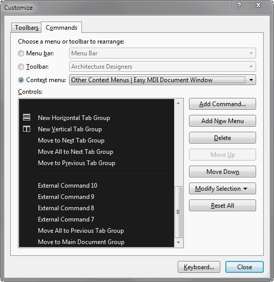 現在要將這些新命令新增到檔案索引標籤 контекстное меню (context menu,快顯功能表) 中,請前往工具->自訂...,選取命令索引標籤,按一下快顯功能表的單選按鈕,然後選取其他快顯功能表 | 簡易 MDI 文件視窗。