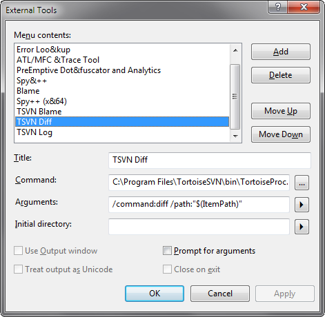 第一步是將 TortoiseSVN 命令新增為外部工具,在工具->外部工具... 選單下。